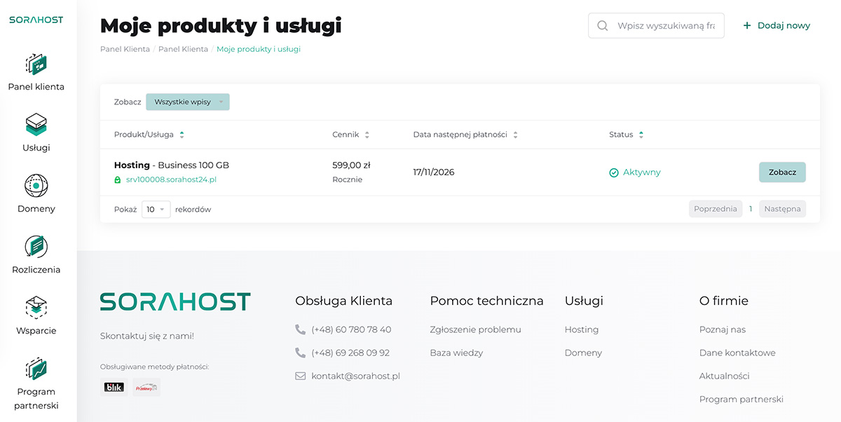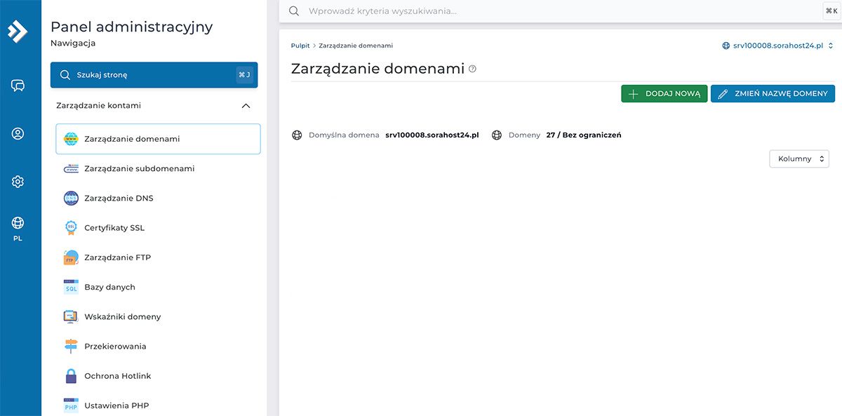Ważne: Aby strona wyświetlała się poprawnie pod nową domeną, pamiętaj o skierowaniu jej na odpowiednie serwery DNS Sorahost. Zmiana rekordów DNS u rejestratora domeny może potrwać do 24 godzin (tzw. propagacja), ale domenę do panelu możesz dodać już teraz.